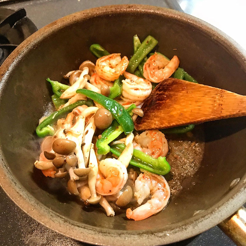 クミンシードを熱したオリーブオイルに入れて香りが立ったらピーマンと冷凍してあった剥きエビとしめじを炒めた。キノコは冷凍しただけで旨味が増すので冷凍庫には大抵何かのキノコが入ってる。