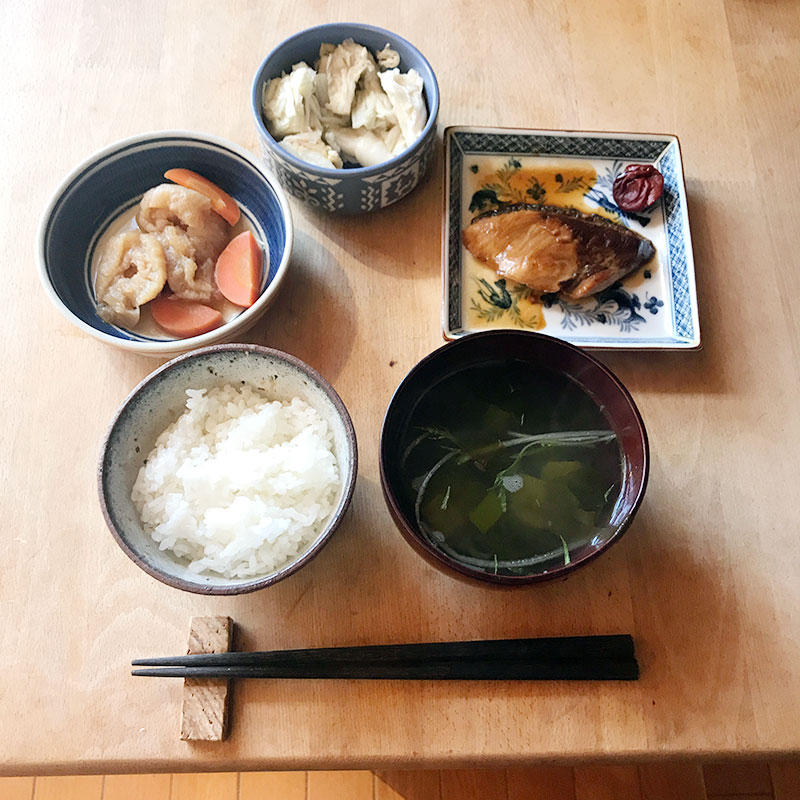 見事に日本の年配おやじの食事。へそ大根の煮物。自家製白菜漬け、ブリの照り焼きと部落の名人の梅干し、生わかめと胡麻のスープ、つや姫のご飯。