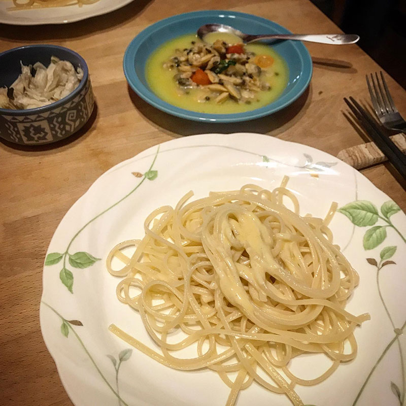 幼なじみにもらったイタリアのゆっくり乾燥させたリングイネにかけて。