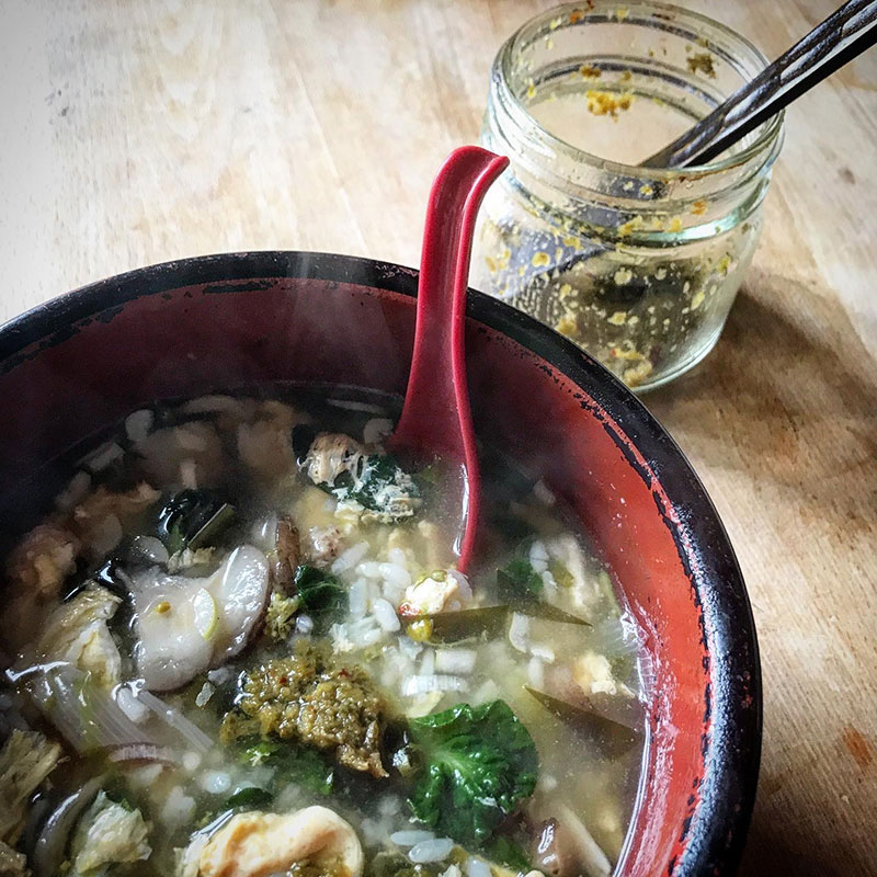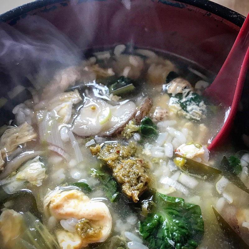 昨日の鍋でおじやのお昼。雨の肌寒い日に温まる。