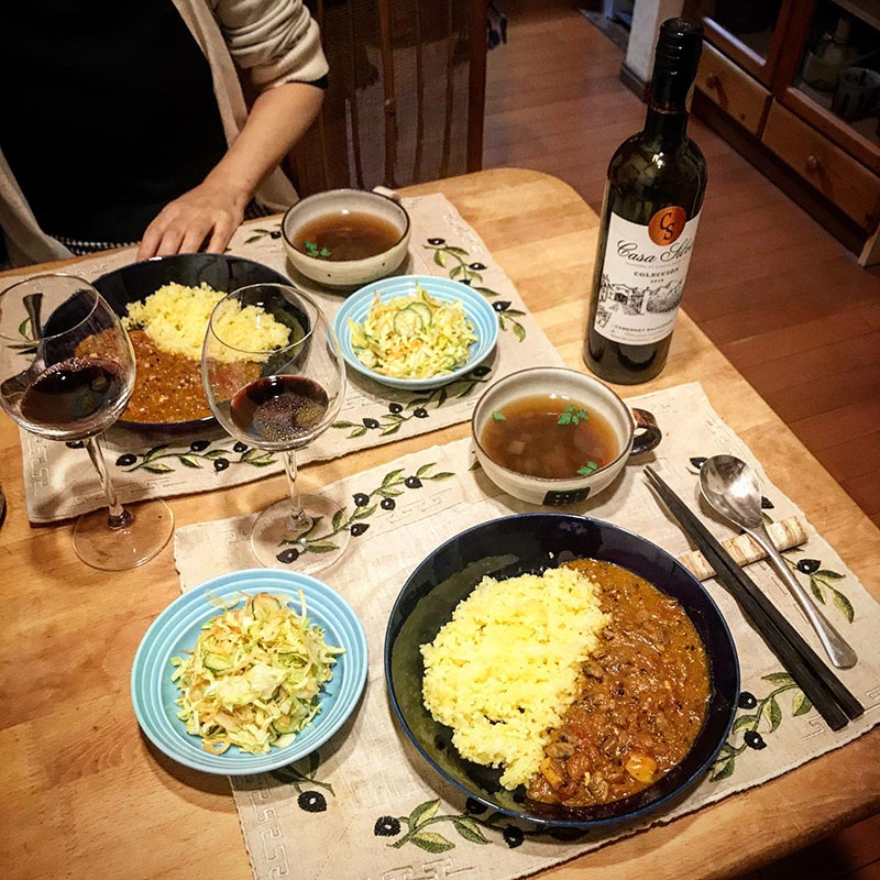 赤ワインで乾杯。誕生日おめでとう!スパイスカレーに赤ワイン合うね。