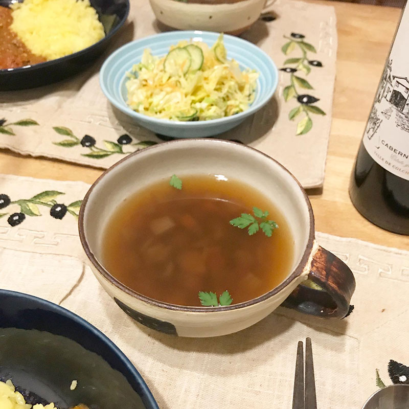 にんじんと玉ねぎハンドブレンダーにかけたドレッシングのサラダと野菜から出汁をとったスープで誕生会。