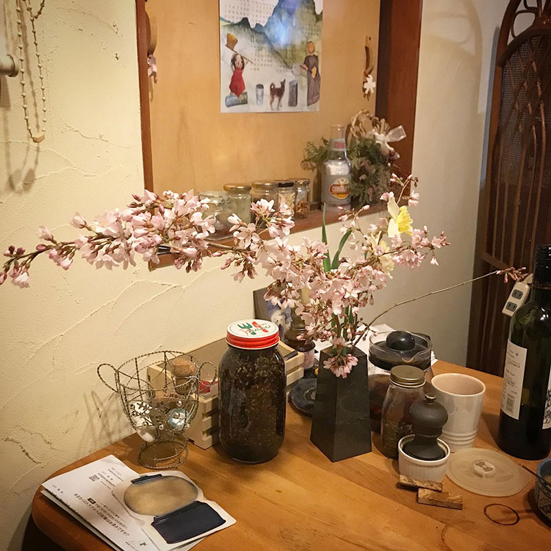 テーブルには伊達冠石で作った一輪挿しに挿したあやこさんにもらった桜と水仙。石の花器は重いので枝物挿しても倒れない。