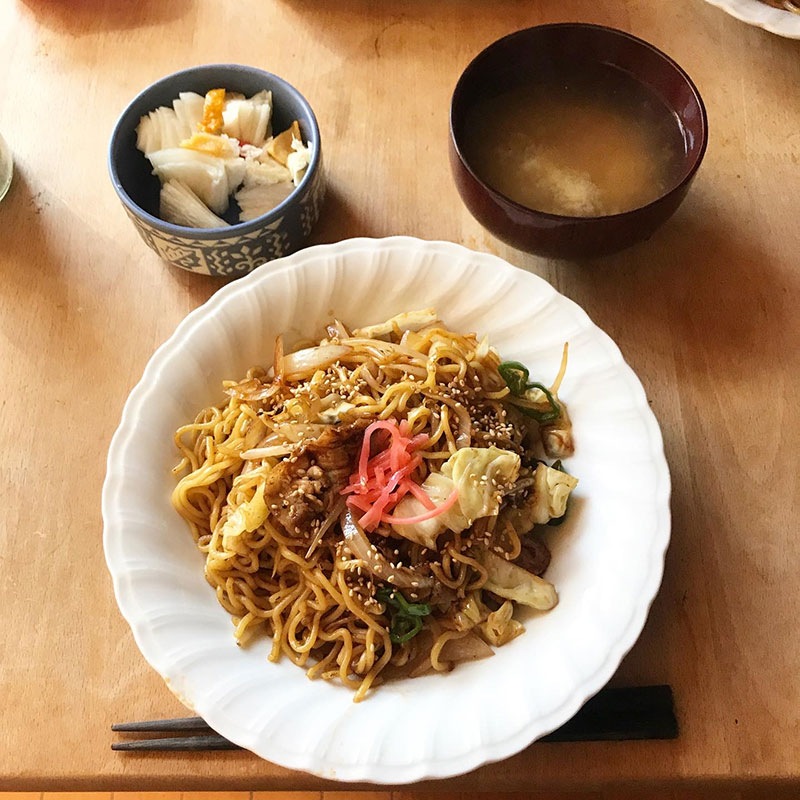 昼は白菜漬けと味噌汁と焼きそば。