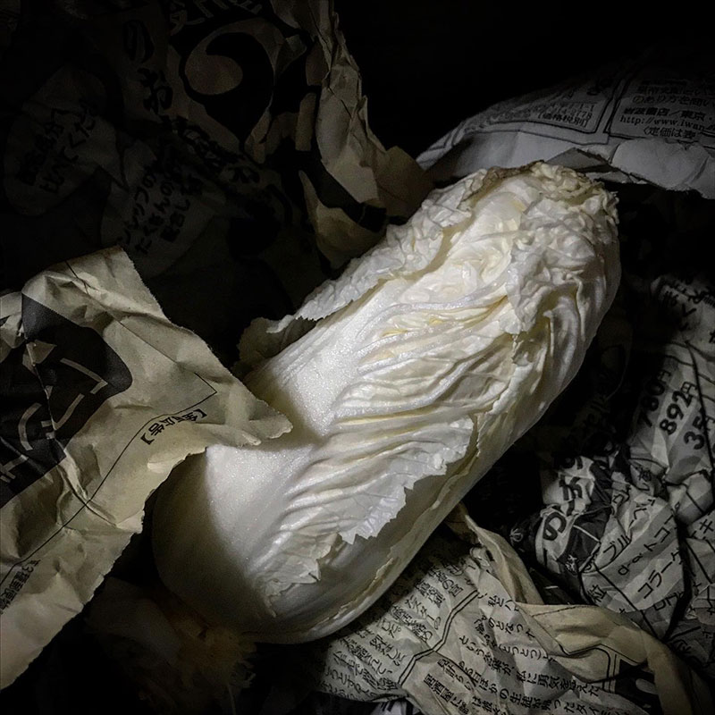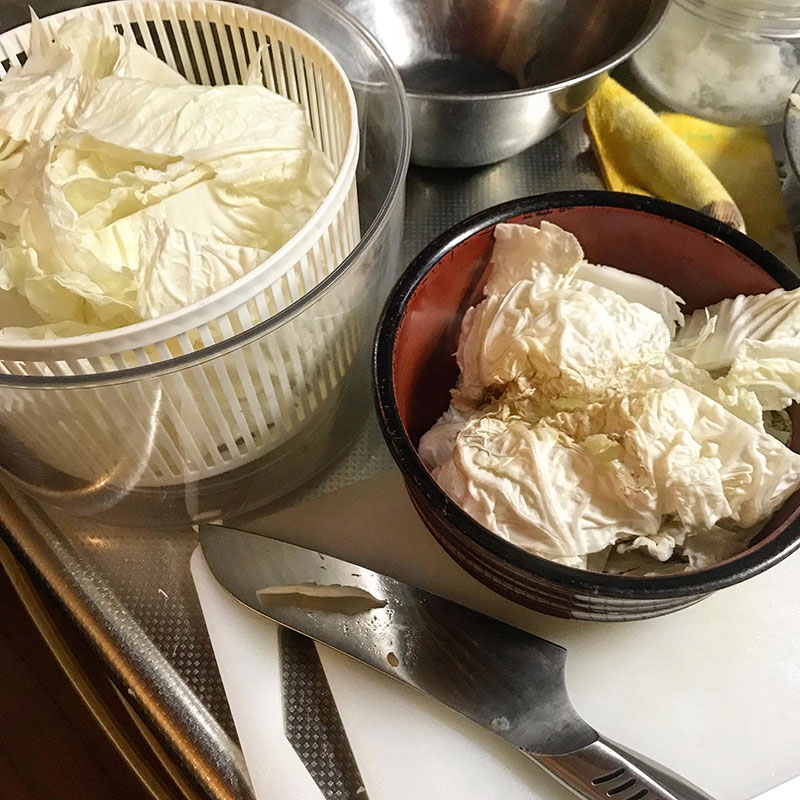 たくさんいただいて寒い部屋に新聞紙にくるんで貯蔵していた白菜。白菜漬けにしたりラーパーツァイにしたり、鍋にしたり。いよいよ最後のひとつ。