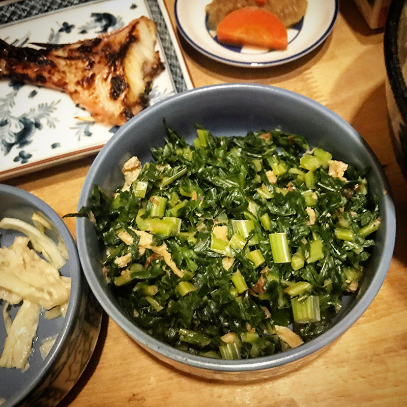茹でて冷凍しておいた大根の葉をカミさんが炒め物にしてくれた。近所の方に大量に大根を頂いた時に必死に全部の葉っぱを大鍋で何回も茹でて冷凍しておいた。冬の間中食べられた。苦労が報われた。