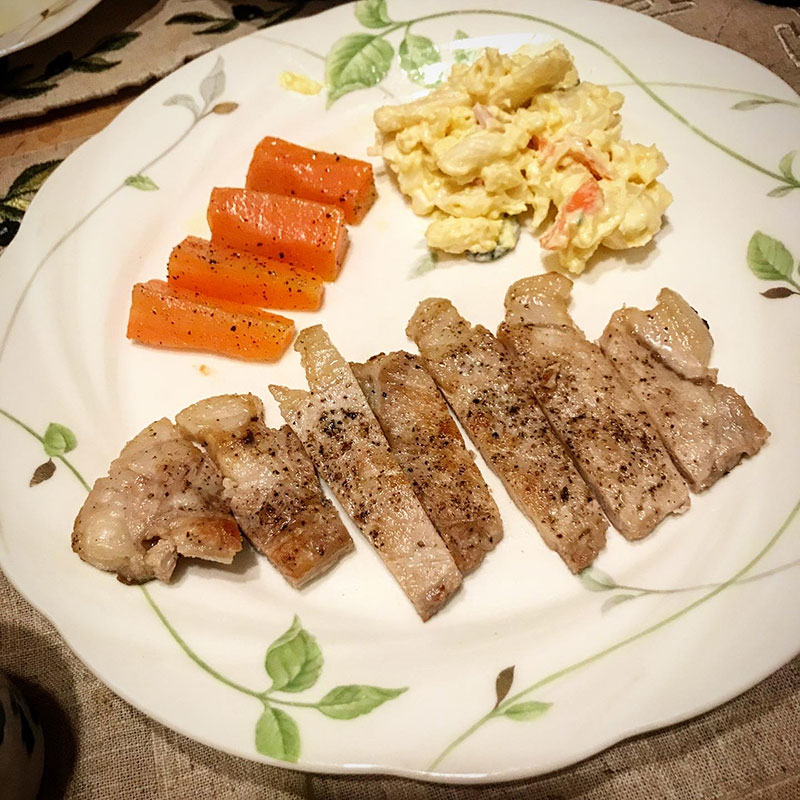 カミさんが豚肉焼いてくれた。マカロニポテトサラダとレンチンのニンジンのグラッセ。僕はサラダ作り。レタスにキャベツ、玉ねぎスライス、にんじん、コーン。栗原はるみさんの玉ねぎすりおろして作るドレッシングが美味し過ぎ、最近はニンジンのすりおろしも加えたりビネガーの種類を色々変えてみたりアレンジも楽しい。
