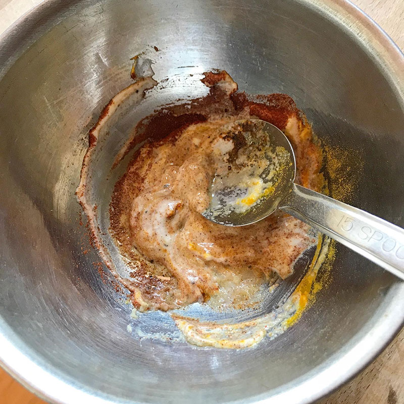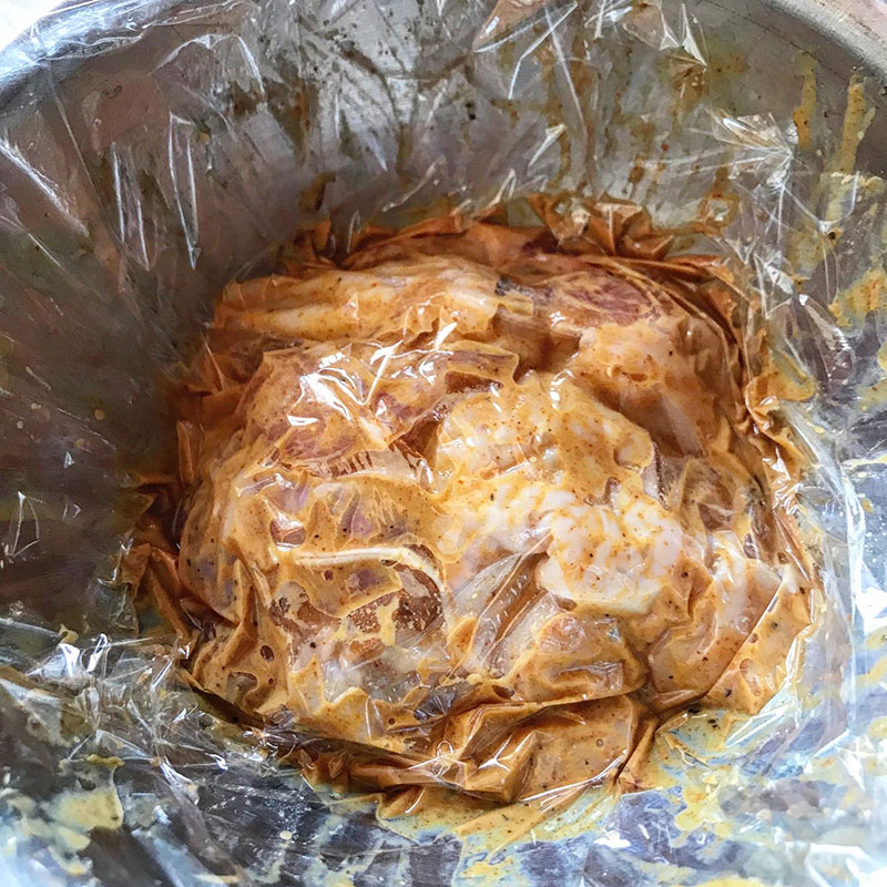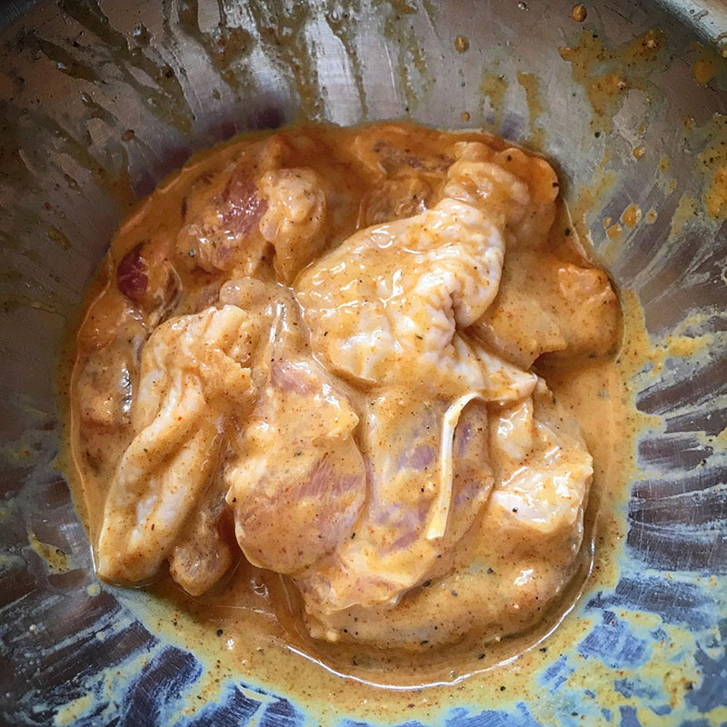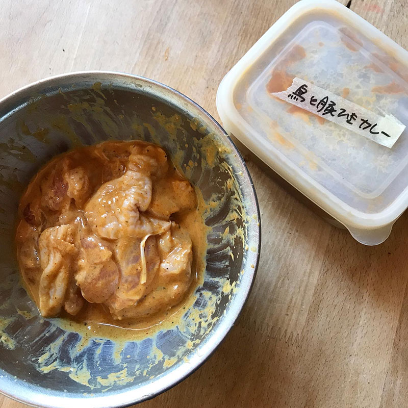 ヨーグルトや各種スパイスともんでボールに漬けておく。