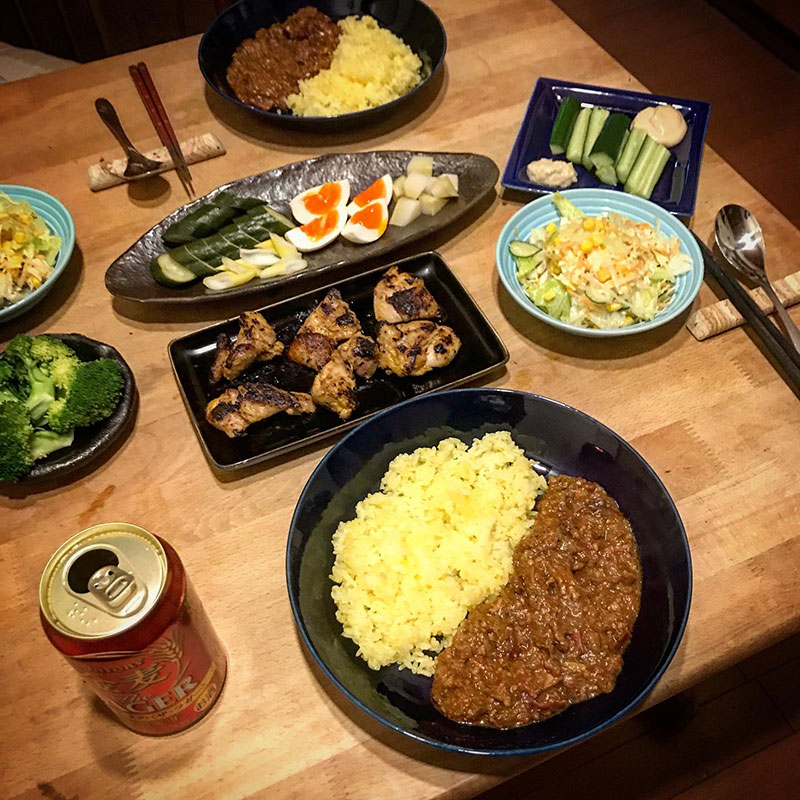 昼に仕込んだタンドリー風チキンは漬け込み過ぎてスパイスの良いところが飛んだ。でもヨーグルトのおかげで柔らかい仕上がり。つまみには最高。