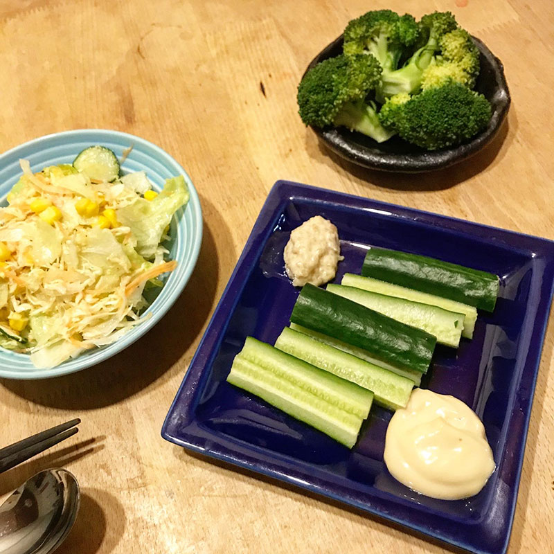 きゅうりとブロッコリーは自家製バルサミコ酢のマヨネーズとMaoさんにもらったカルディのいぶりがっこのタルタルソースで。