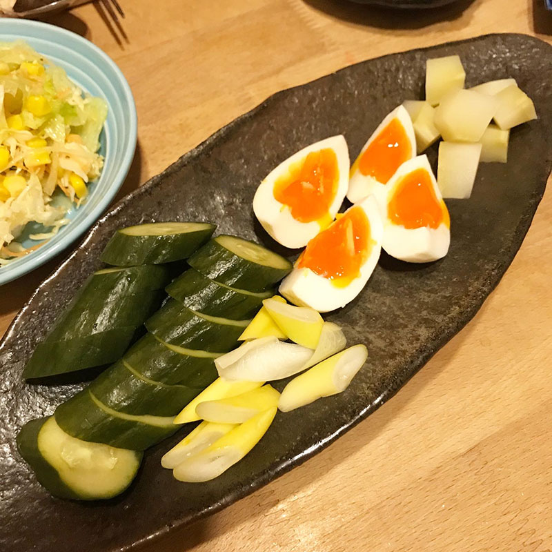 ぬか漬けは半熟ゆで卵、ブロッコリーの茎、長ネギの芯、きゅうり。