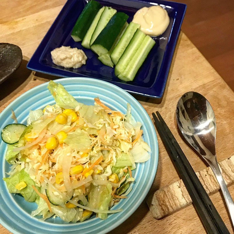 玉ねぎとにんじんすりおろしがベースのドレッシングのサラダ。レタス、キャベツ、きゅうり、玉ねぎ、にんじん、水煮コーン。金麦。
