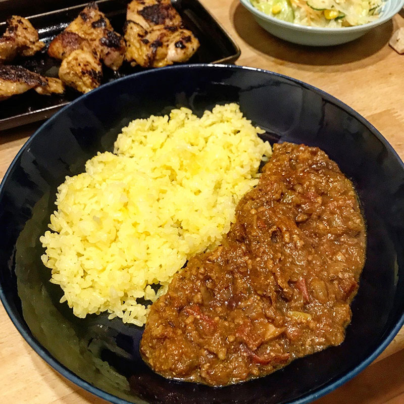 冷凍して熟成させておいたカレーをあえて浸水しないで炊きたてのターメリックライスで。
