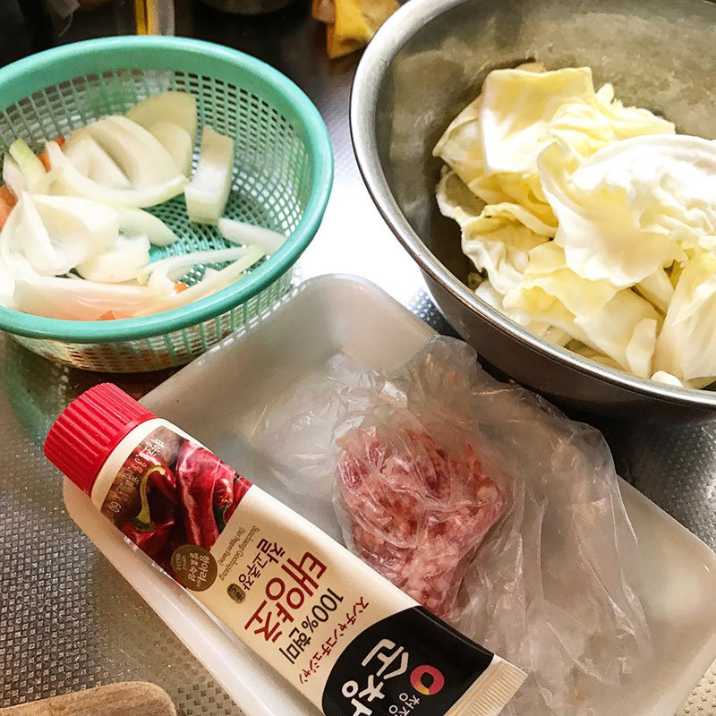 炒める時にコチュジャン少し入れてひき肉と野菜たっぷりで作った。