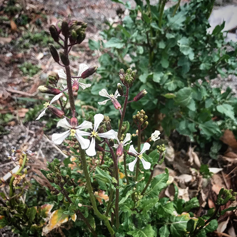 畑には白くて小さなルッコラの花。自家採種できるかな。