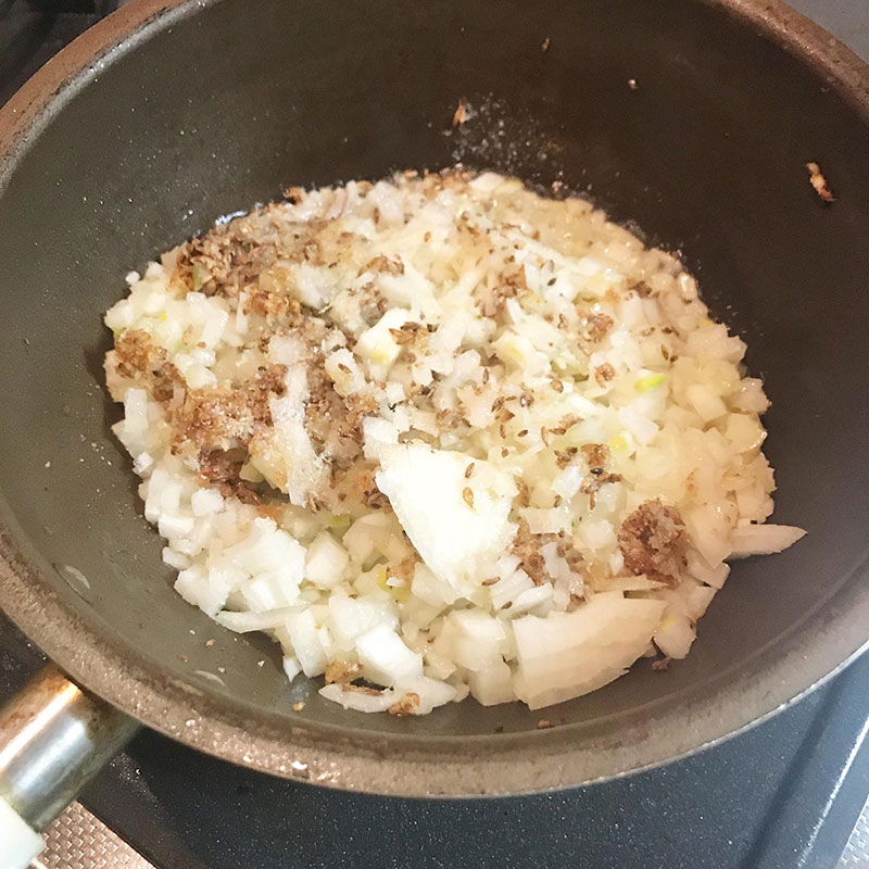 すりおろした生姜とにんにく炒めて玉ねぎ炒める。スパイス焦げやすいので玉ねぎに乗せる感じで。
