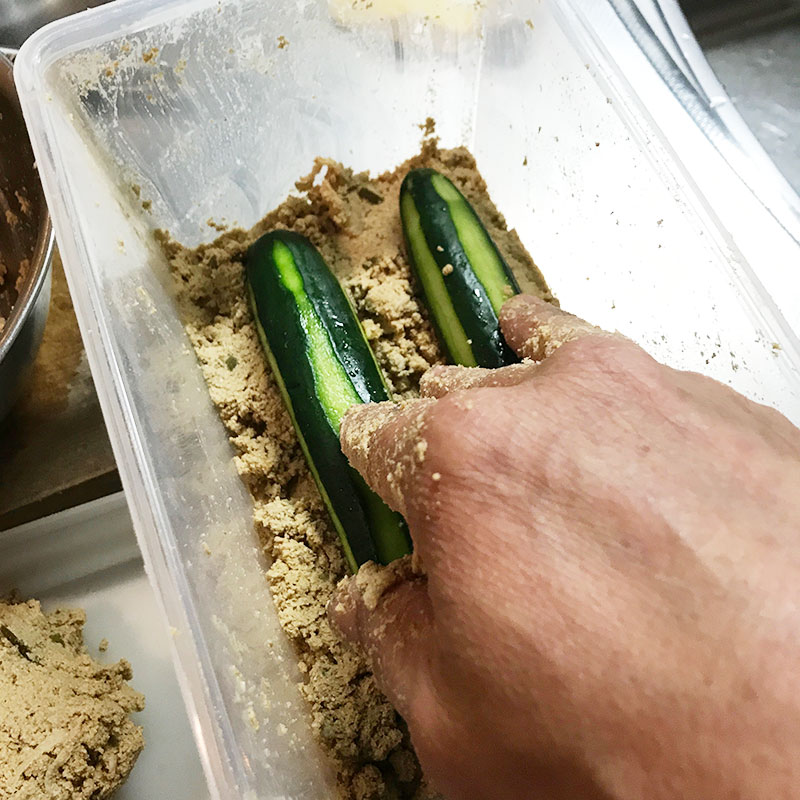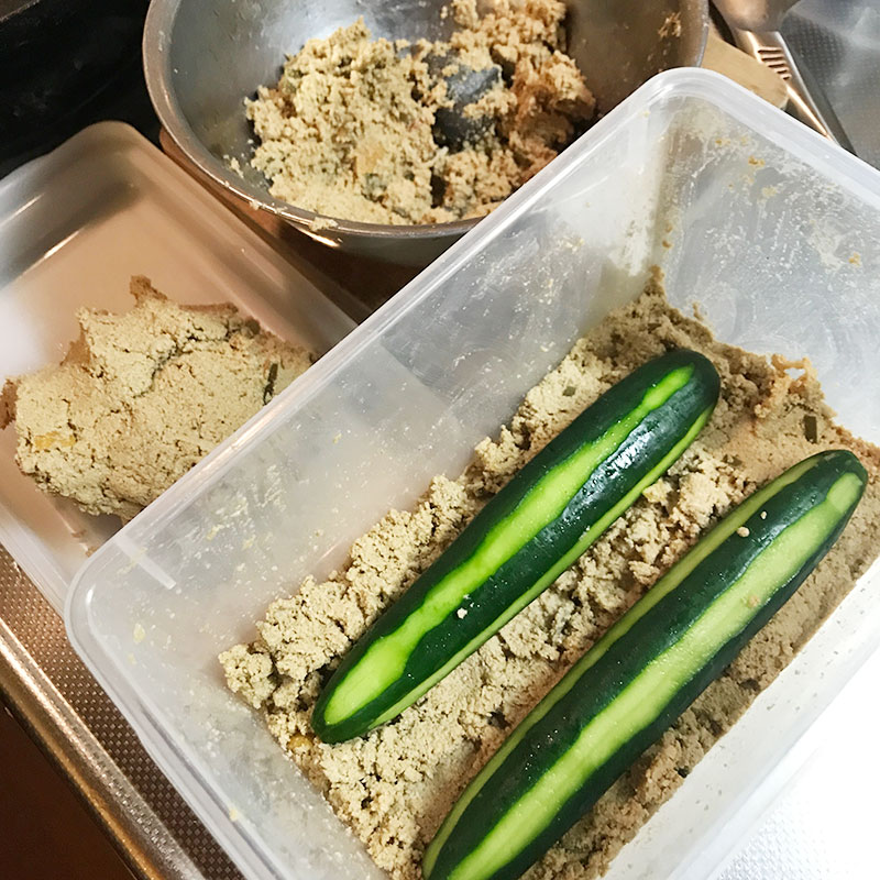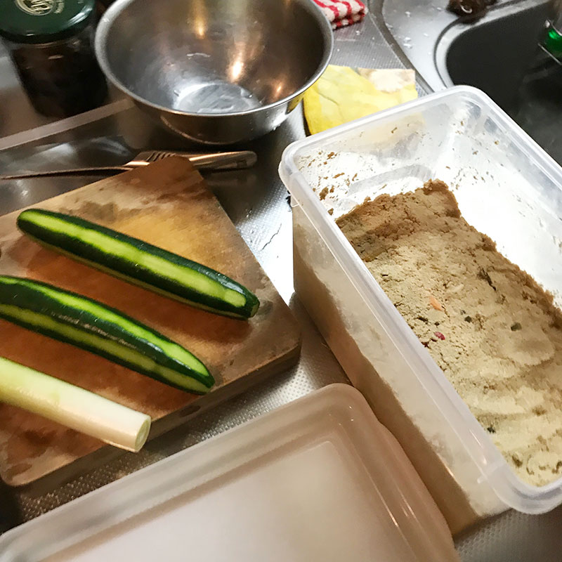 きゅうり塩で板ずりして糠床へ。畑の長ネギも。