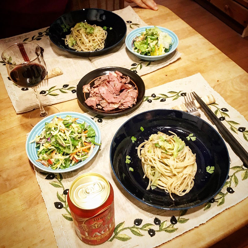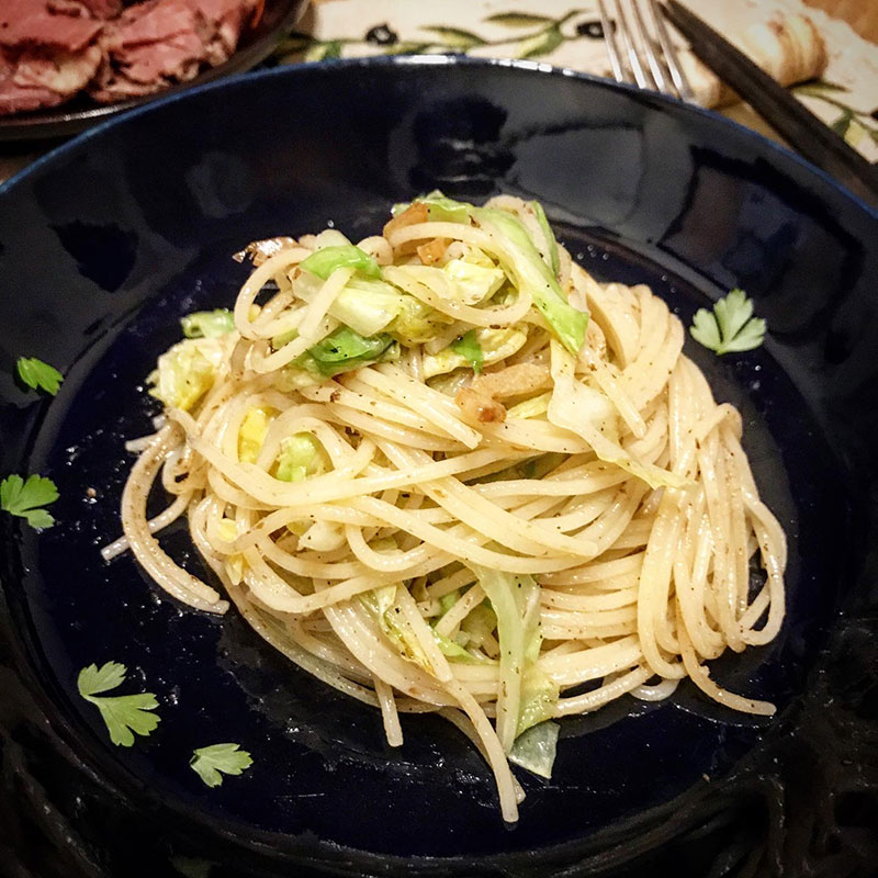 居酒屋我家、開店。アンチョビと春キャベツのパスタ作った。