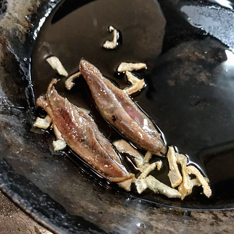 アンチョビまな板でみじん切りすると汚れるけど煮ながらヘラで潰せるので僕は切らずに投入して粉々にする派。