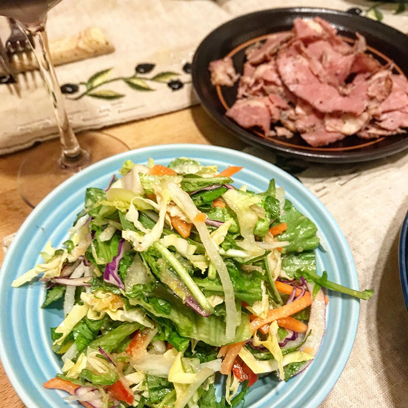 玉ねぎとにんじんすりおろしたドレッシングのサラダ。コンビニのペッパービーフ。