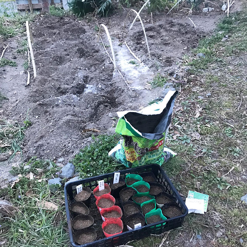 仕事から家に戻って日暮れまでの1時間畑仕事。肥料のすき込み