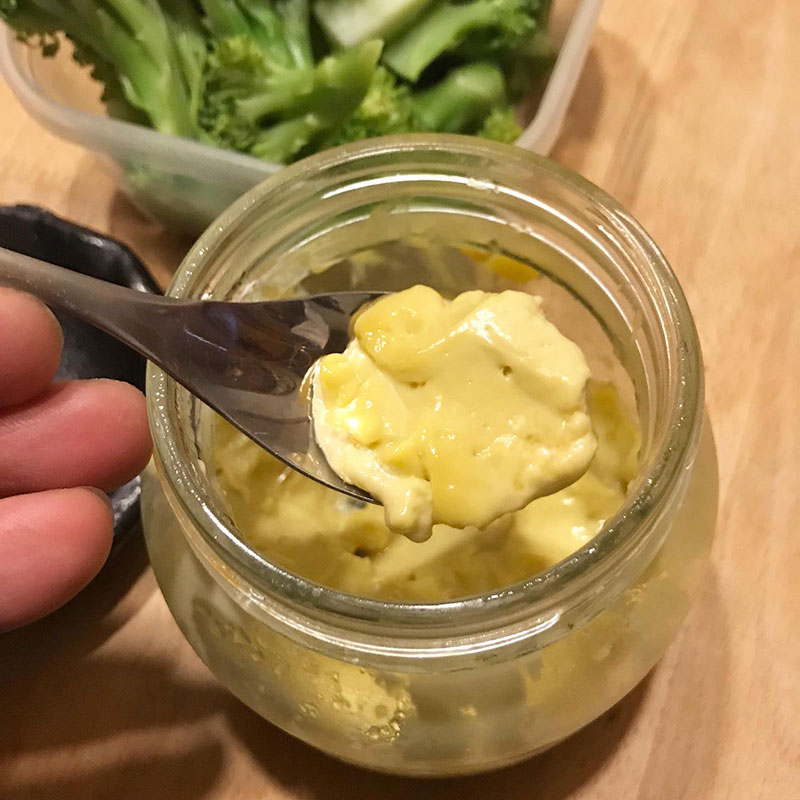 早摘みグリーンオリーブのエクストラヴァージンオリーブオイルで作ったマヨネーズは少し緑がかってる。最初苦味もあってクセが強いと思ったけどこれはこれで美味しい。ブロッコリーにつけたりすると。