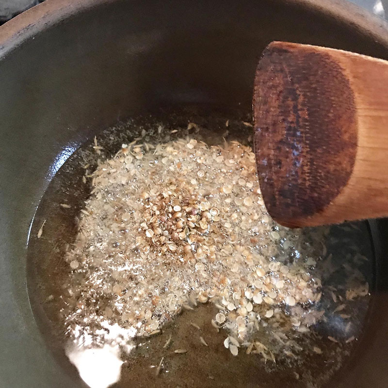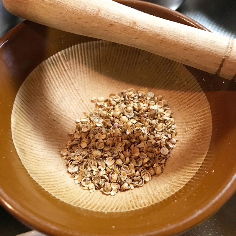 コリアンダーシードをガリッと噛むのは苦手なので事前にすり鉢で潰しておくんだけどまるで花園にいるような香りに包まれる。