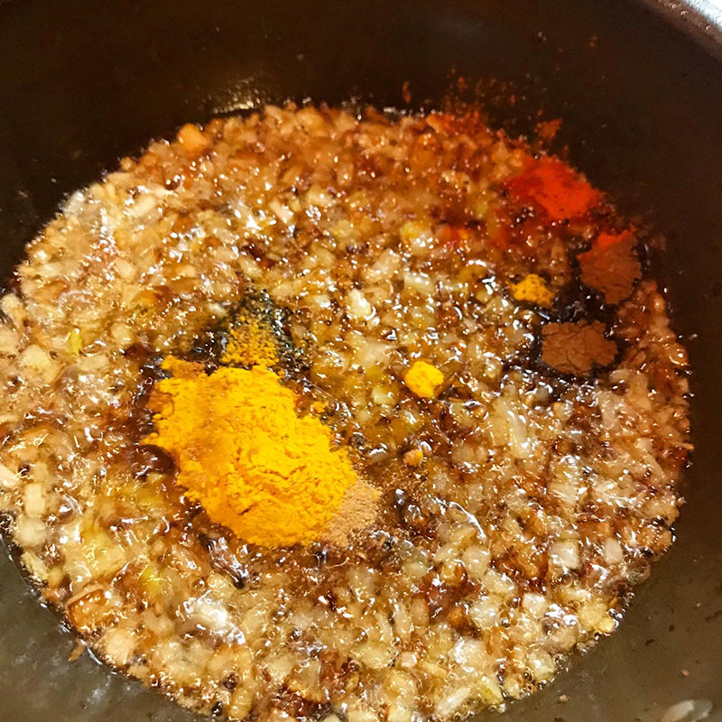 すりおろしたニンニク生姜に続いてみじん切りの玉ねぎ。スパイスを玉ねぎの上に乗っけてあげて水出しの塩してしばらく放っておく。これで玉ねぎを色づくまで炒める時間がかなり短縮できる。