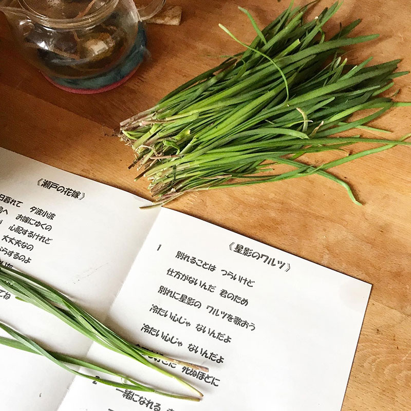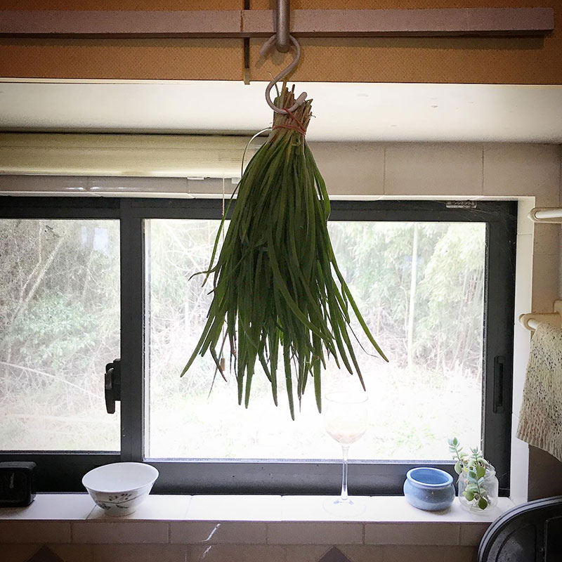 朝、収穫した畑のニラを洗ってぶら下げて水気を切っておいた。