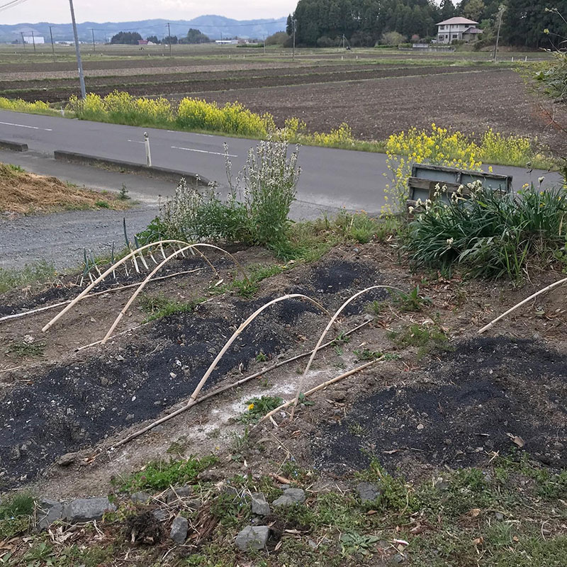 #庭の猫の額畑 に燻炭(籾殻を炭にしたもの)。