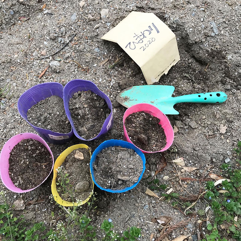 去年自家採種したひまわりは土手にまいて残りをポットに。