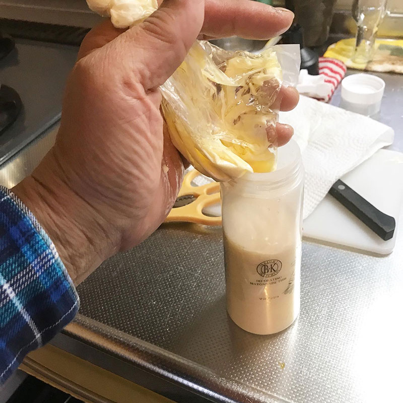 角を切って絞り出せばいい。大成功!!破れるかもしれないと思ったけど薄いビニール袋でも問題なかった。とりあえず自家製マヨネーズ問題は解決・笑