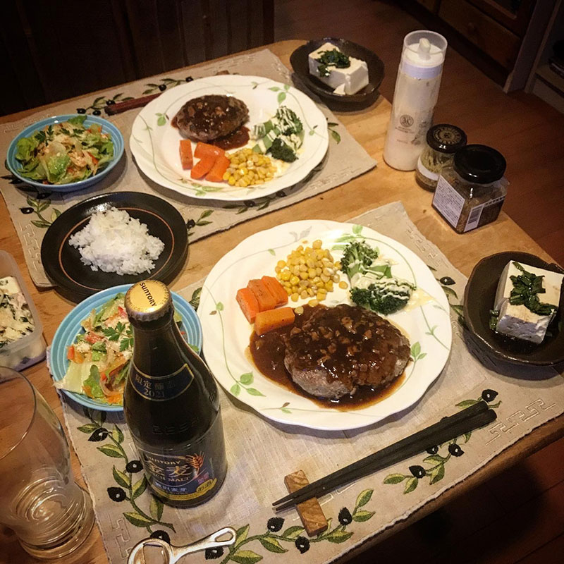 居酒屋我家、開店。カミさんがハンバーグ作ってくれた。この前の誕生日の日にカミさん仕事で遅くてローストビーフや美味しいケーキ屋さんのショートケーキ買ってきてくれて充分嬉しかったんだけど、手作りの料理作れなかったからって今宵。嬉しい。