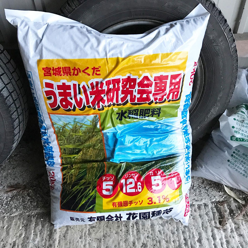 うまい米研究会専用の肥料いただいた。美味しいお米を作るために特別に配合されたもの。田んぼ用だけどもちろん畑の野菜も美味しくしてくれる。これだけあれば我が家の猫の額の畑なら一年分以上。