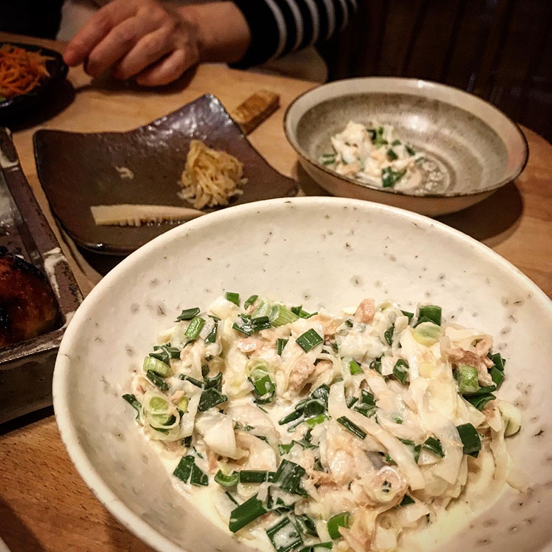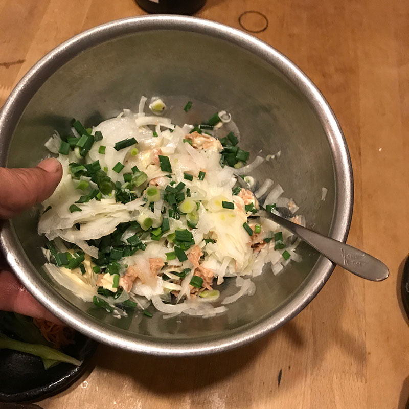 葉玉ねぎの葉を細かく切って実は薄くスライスしてマヨネーズとポン酢のサラダ。
