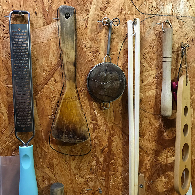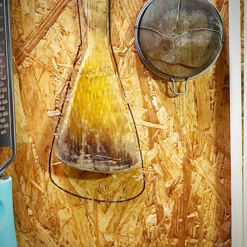 今の家をカミさんと作った時に台所の調理器具をかけられる壁もDIYした。料理に使ってる木べらをかけるところを決めて輪郭線を油性マジックでなぞったんだけど16年でこれだけ小さくなった。