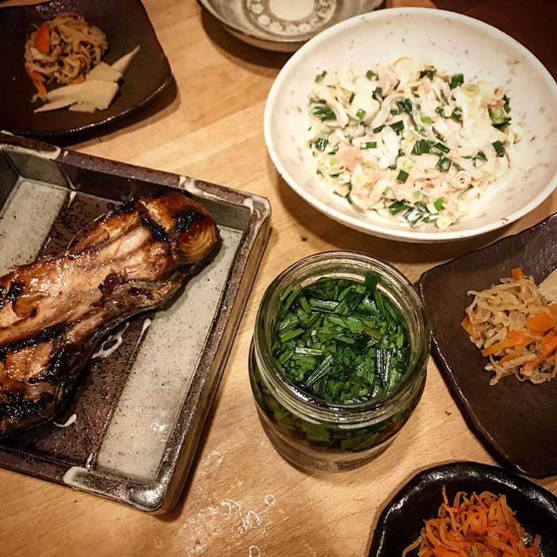 葉玉ねぎって美味しい。自家製切り干し大根の煮物。にんじんしりしり。筍。秋田の日本酒、高清水と