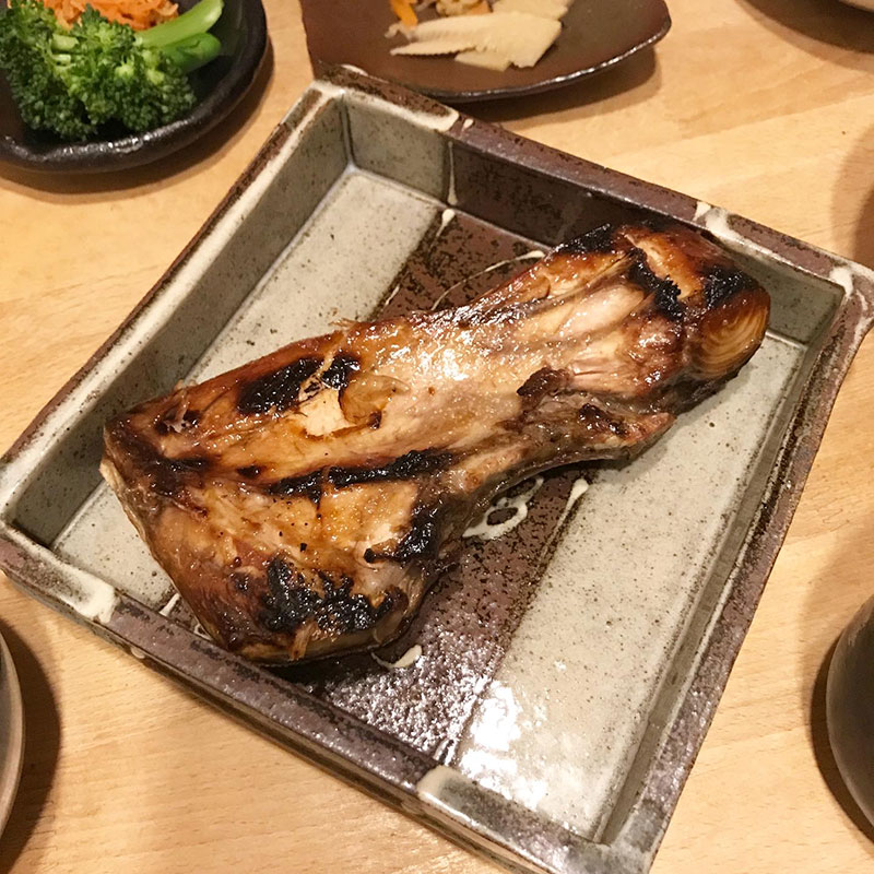 ぶりかま、窮屈だけど大学時代の友だちの陶芸家の四角い器に盛って。