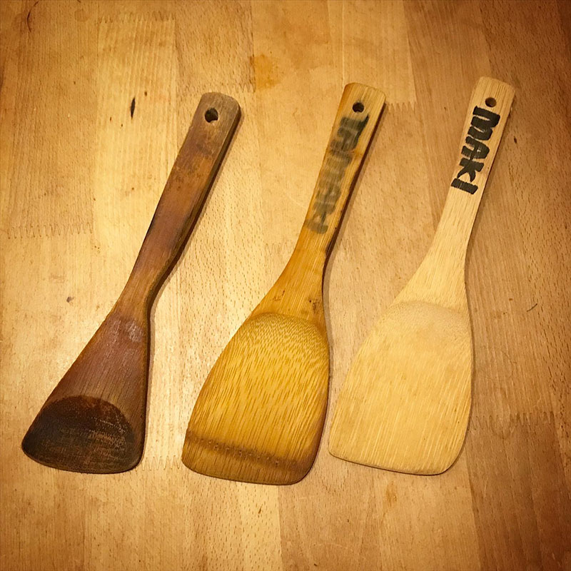 断捨離継続中なので新しいものを買ったら捨てないと。使い込んだ木べらは買えないけど新しい木べらは買えるからちびた方だけ残して2本捨てる。