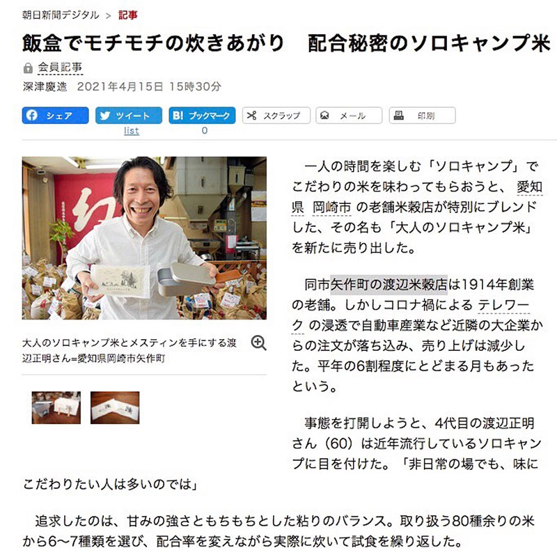 だけど先日愛知県のいとこがソロキャンプブームの中、メスティン用に特別にブレンドした米の販売を始めて朝日新聞に取り上げられた。