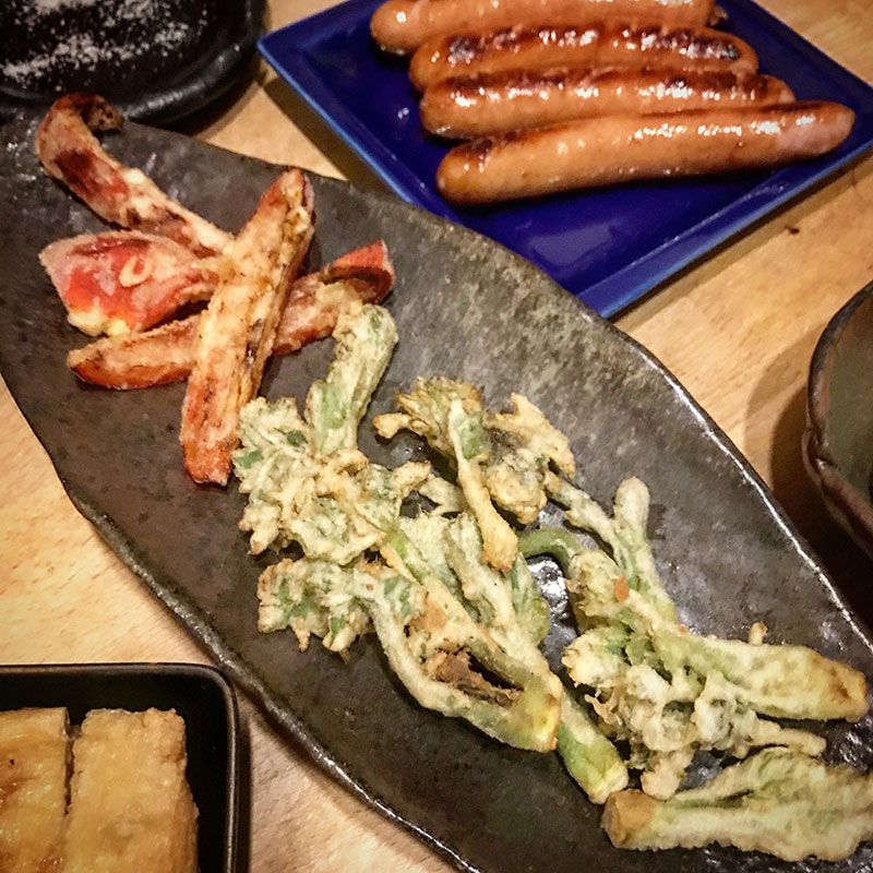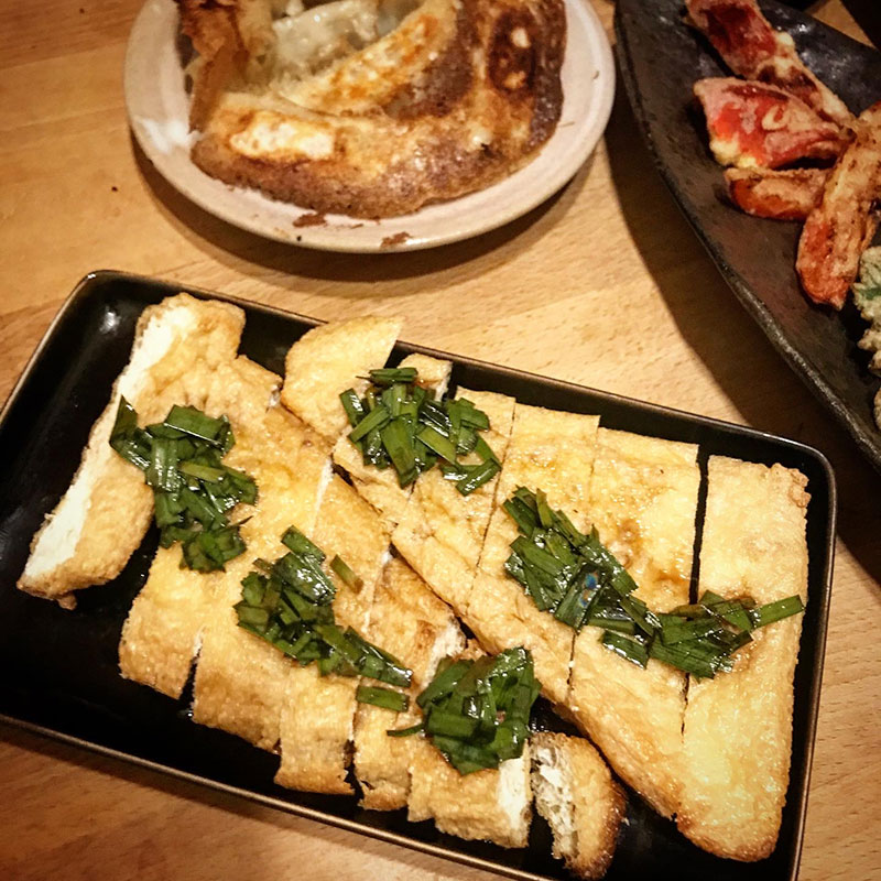 三角揚げをカリカリに焼いて畑のニラで作った自家製ニラ醤油かけて。最高の居酒屋メニュー。羽付き餃子。
