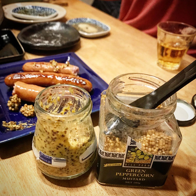 ソーセージをフライパンに少しの水と入れてボイルした後水がなくなったら焼き付けて粒マスタードとグリーンペッパーコーンのマスタードで。
