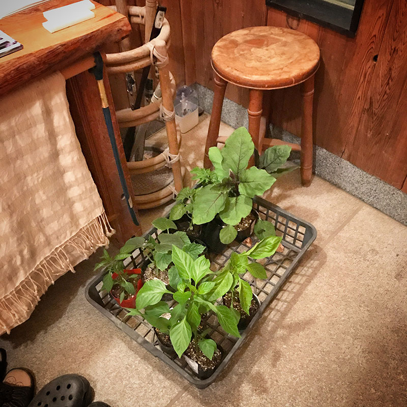 昨日買った夏野菜の苗は玄関に避難。