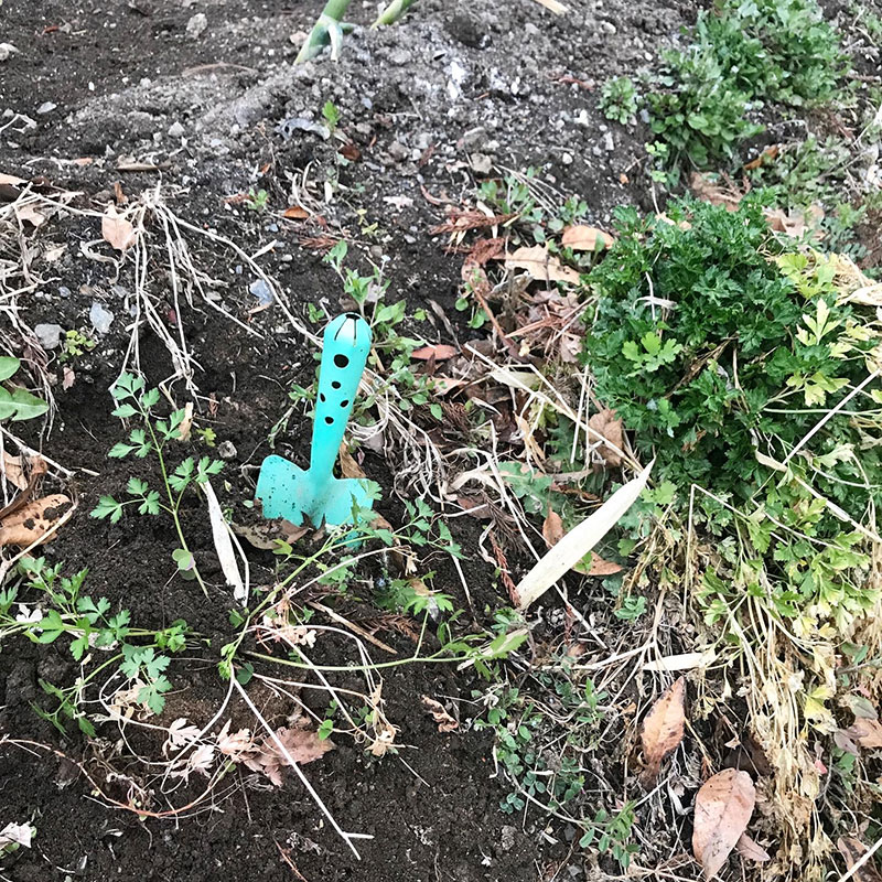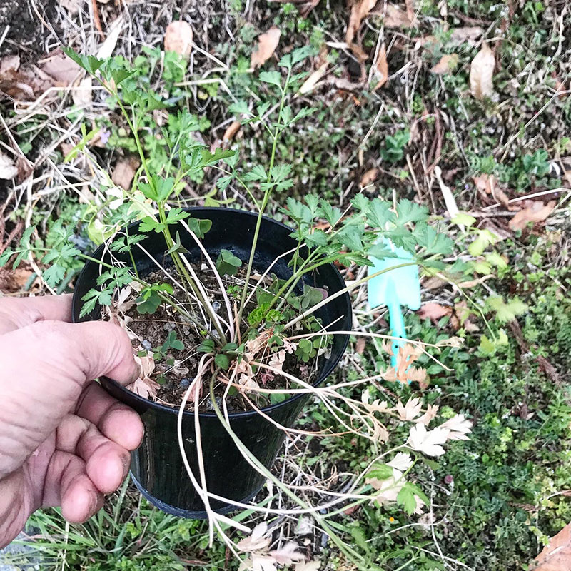 畑に戻した。畑で冬越しした大きなイタリアンパセリの横に。冬越しした方は葉がボロボロでもう食べられない。