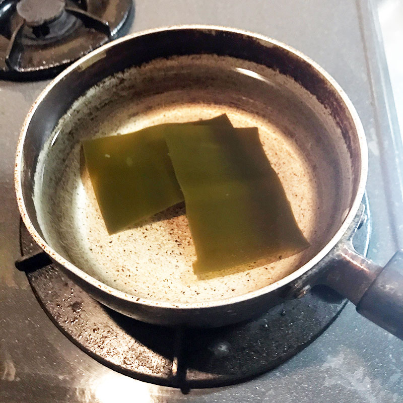 一昼夜水に漬けた昆布、冷凍しておいたどんこ椎茸、出汁パックで出汁をとってかえしと合わせてさっとニラを煮た。