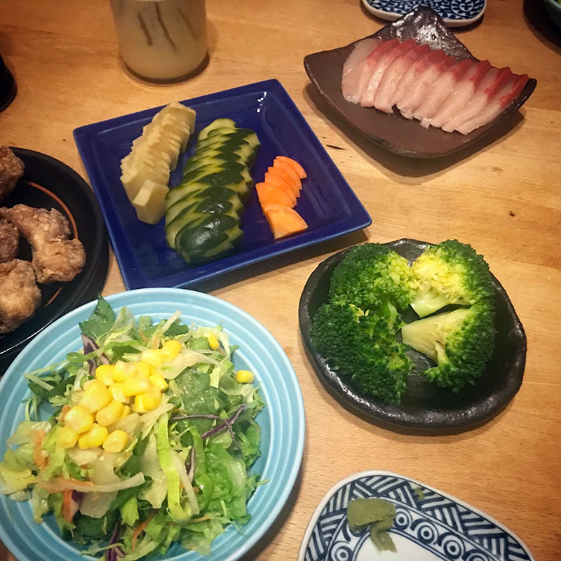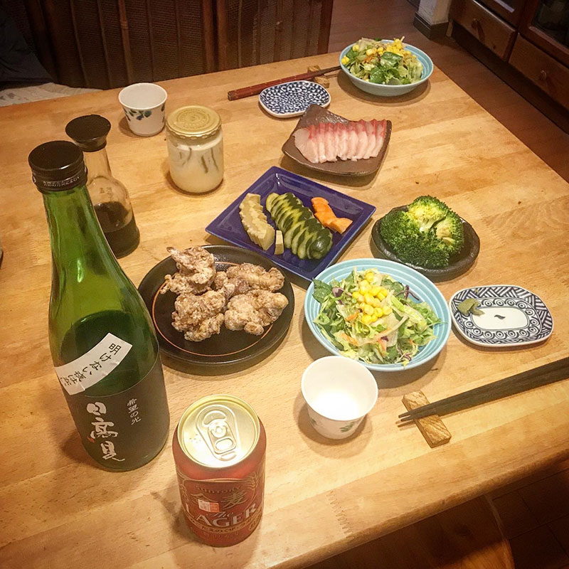 居酒屋我家、開店。一日、出かけてたので塩麹に漬けた鳥の唐揚げとブリの刺身買ってきた。