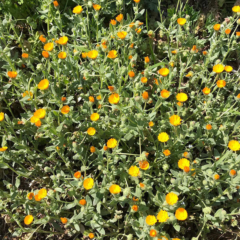 家の土手のオレンジの小さな花を咲かせる草は抜かないでいたらこの春、一面オレンジ。