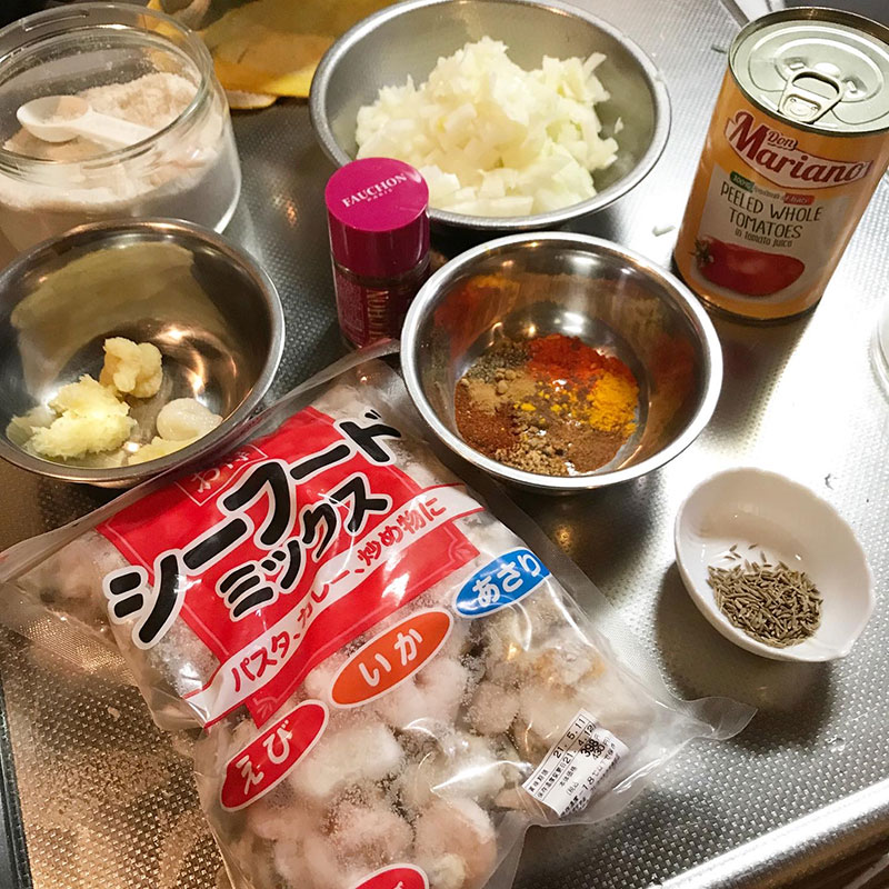 冷凍シーフードがあったのでシーフードのスパイスカレーにする。