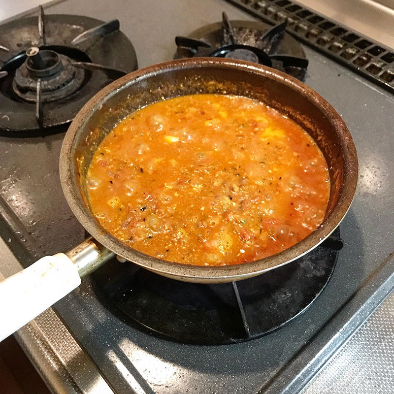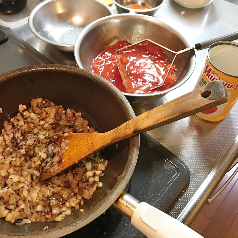 玉ねぎ、飴色になるまで炒めたら完成までもう少し。