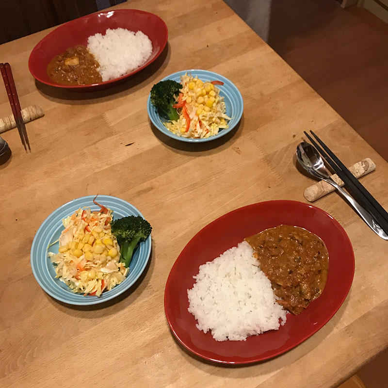 カミさんも僕も朝から遅くまで仕事の日。そんな日にありがたいスパイスカレー、僕の方が少し早く仕事終わったので作る事にする。風呂上がりから急いで作っても30分もかからない。玉ねぎみじん切り、ニンニク生姜すりおろし。グリーンカレーとか例外を除いてここまでは大抵一緒。